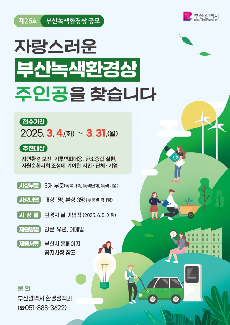 ‘부산녹색환경상’은 ▲개인(가족) ▲단체 ▲기업, 총 3개 부문으로, 본상 3명(분야별 1명)과 대상 1명을 선정해 부산광역시장 상패가 수여된다.