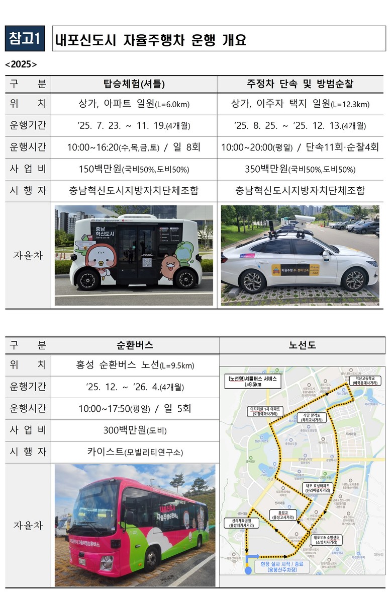 한편 도는 2022년 12월 ‘충청남도 자율주행자동차 시범운행지구 비전 수립 연구용역’을 완료한 뒤, 내포신도시에서 2023년 10∼11월 자율주행차 탑승 체험, 2023년 11월∼2024년 6월 자율주행차 주정차 계도 및 방범 순찰 등을 진행한 바 있다.