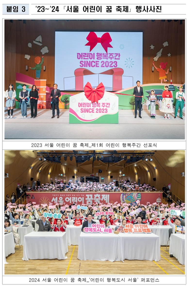 올해로 3회째를 맞는 <서울 어린이 꿈 축제>는 ‘알파세대’ 어린이의 행복에 초점을 맞춘 종합계획인 「서울 어린이 행복 프로젝트」의 하나로, 어린이의 잠재능력과 창의력을 키우고 사회 전반에 어린이 존중 문화를 확산하기 위해 마련된 행사다.
