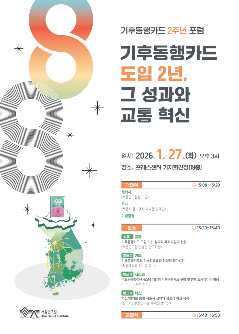 - 도입 후 2년간 누적 충전 건수 1,745만여 건, 하루 평균 이용자 72만 명 [서울 세계타임즈=이장성 기자] 서울연구원(원장 오균)은 27일(화) 오후 3시, 한국프레스센터 기자회견장에서 「기후동행카드 도입 2년, 그 성과와 교통 혁신」을 주제로 기후동행카드 2주년 정책 포럼을 개최한다.