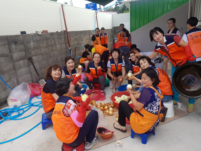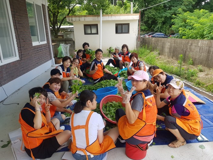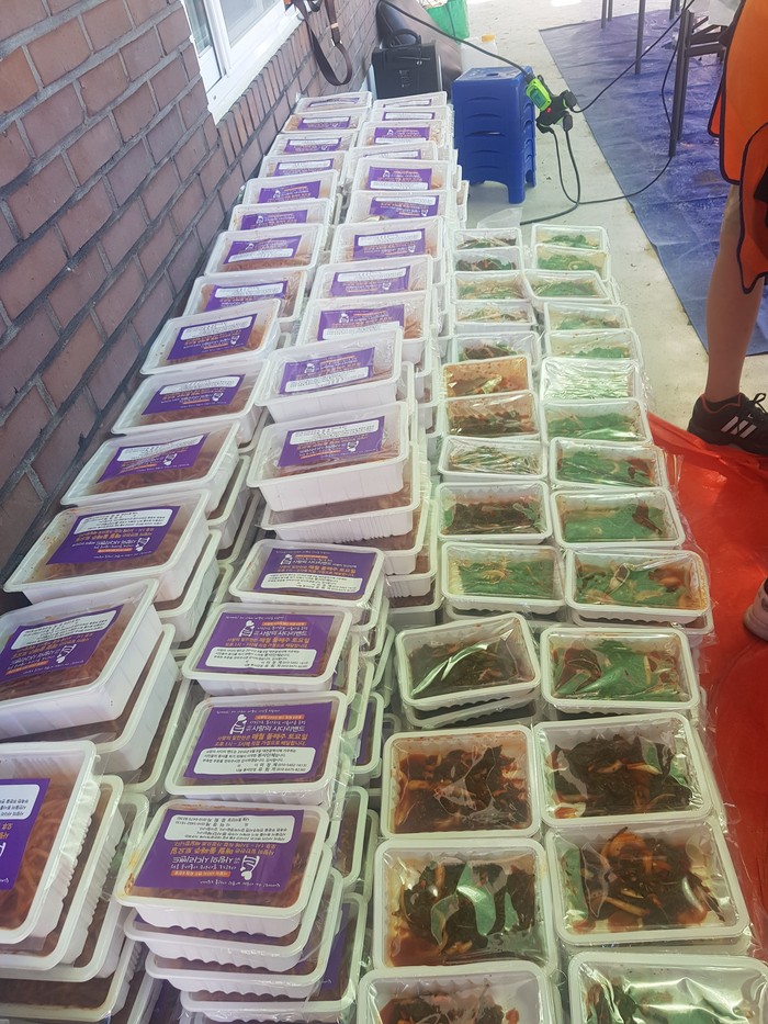 이날 뜨거운 날씨에도 100여명의 회원들이 참석을 하여 깻잎무침, 버섯어묵볶음, 무우생채 3가지 밑반찬을 만들고 직접 배달까지 마무리 하였다.