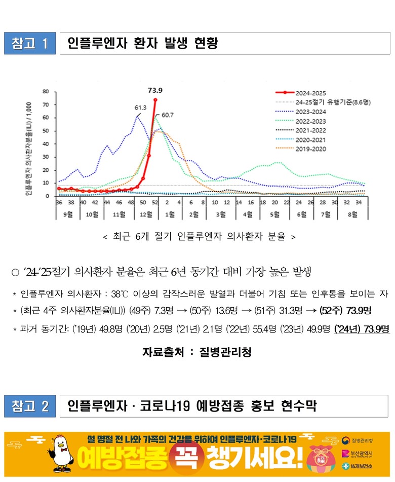 질병관리청 독감(인플루엔자) 표본감시 결과, 지난해(2024년) 마지막 주 외래환자 1천 명당 독감 환자 수는 73.9명으로, 이는 지난 2016년 86.2명을 기록한 이후 최대 수치이다. 코로나19의 경우 같은 주 신규입원 환자 수는 111명으로, 3주 연속 증가했다.