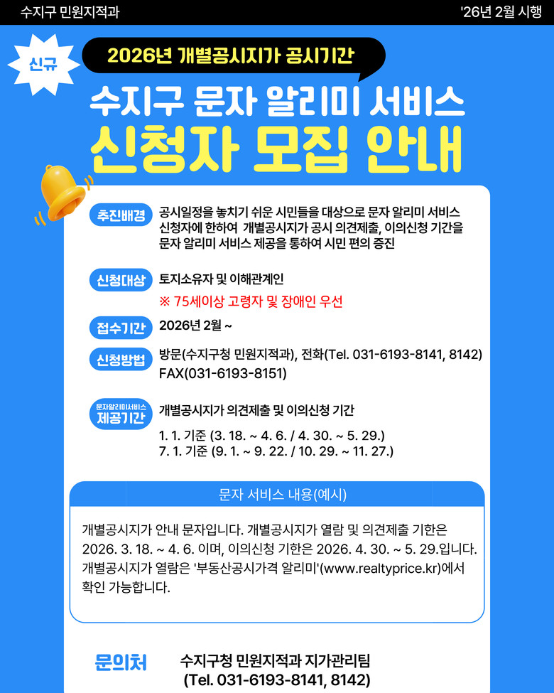 문자 알리미 서비스 이용을 희망하는 주민은 2월부터 수지구청 민원지적과(031-6193-8141)에 방문하거나 팩스(031-6193-8151)로 신청하면 된다.