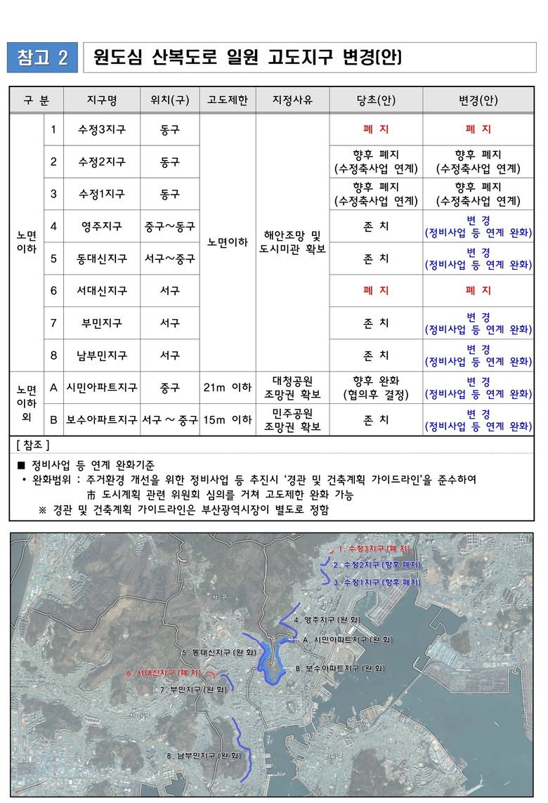 다만, 북항재개발 수정축 일원 개발사업과 연계해 폐지 계획된 ‘수정1·2지구’는 북항재개발 사업성 제고 등을 고려해 이번 완화 대상에서 제외된다.