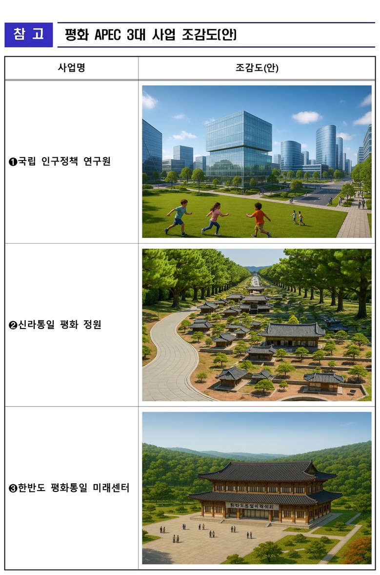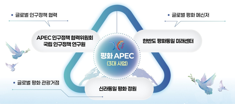 경북도가 추진하는 평화 APEC 3대 사업은 인구정책 협력, 정원 관광, 통일 메신저를 3대 축으로 ▵APEC 인구정책 협력위원회 창설 및 국립 인구정책 연구원 설립(유치) ▵신라통일 평화 정원 조성 ▵한반도 평화통일 미래센터 유치 등이다.