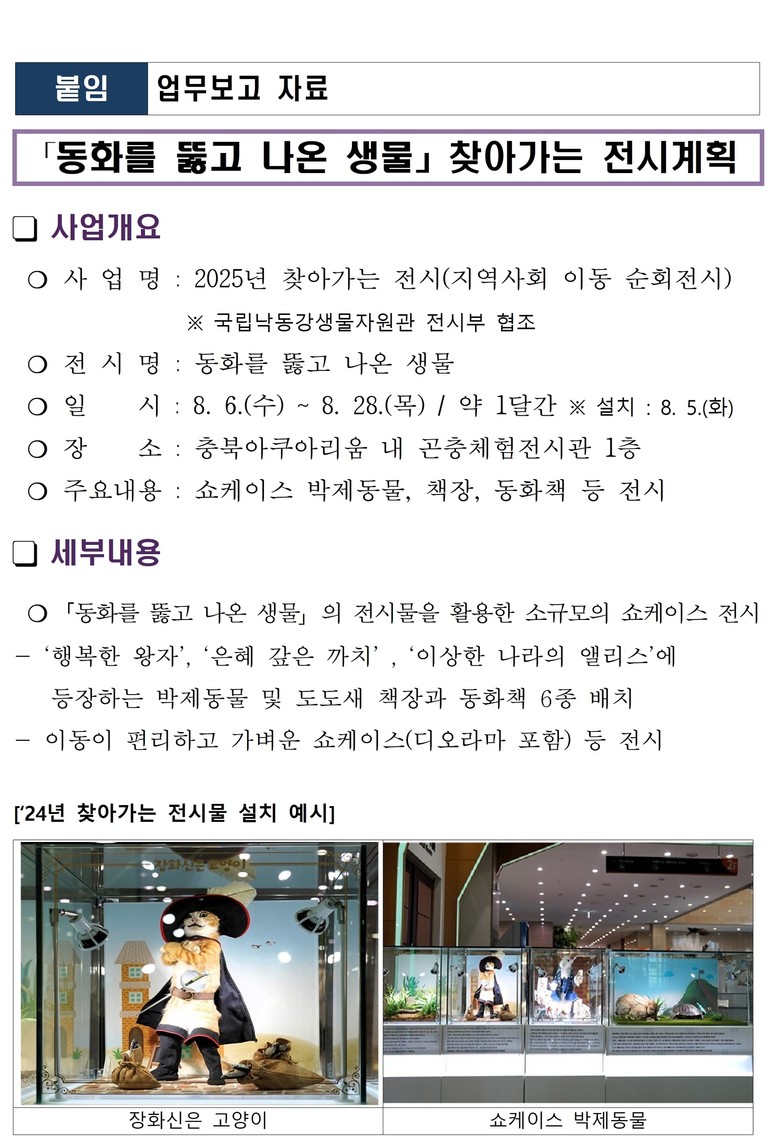 이번 전시는 충북 아쿠아리움 내 곤충전시체험관에서 8월 6일(수)부터 8월 28일(목)까지 3주간 진행 될 예정이며, ‘개미와 베짱이’,‘장화신은 고양이’,‘토끼와 거북이’등 동화속에 등장하는 장면을 생물 박제를 활용해 연출한 전시가 제공 될 예정이다.