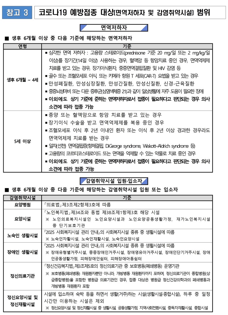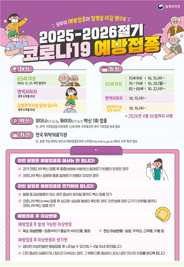 이번 접종은 코로나19 고위험군의 중증화와 사망 예방을 위해 65세 이상 어르신, 생후 6개월 이상 면역저하자 및 감염취약시설* 입원·입소자를 대상으로 신규 백신(LP.8.1) 접종을 시행한다.