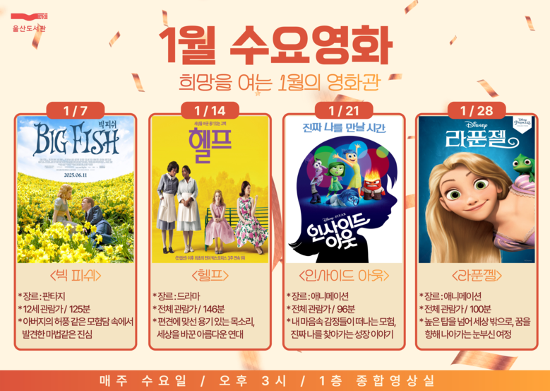 매주 수요일 오후 3시…선착순 50명 입장 [울산 세계타임즈=이호근 기자] 울산도서관이 2026년 새해를 맞아 ‘희망을 여는 1월의 영화관’을 주제로 수요영화를 운영한다.