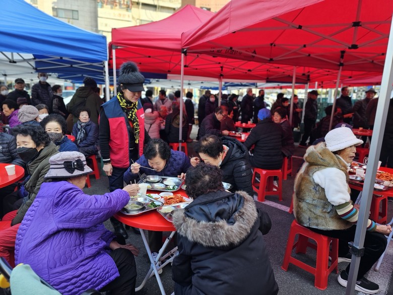 행사에 참여한 봉사단원들은 내 가족이 먹는다고 생각하며 즉석에서 반찬을 만들고 국도 끓인다 오늘은 200분 이상의 어르신들께 따끈한 돼지 수유가 시래깃국에 고소한 밥 특히 오늘은 참석하신 모든분들께 김장 김치 한 쪽씩을 선물로 드렸다 두 달 전에는 라면 5개들이 한 봉지와 빵도 챙겨드리는 나눔 행사를 펼쳤다.