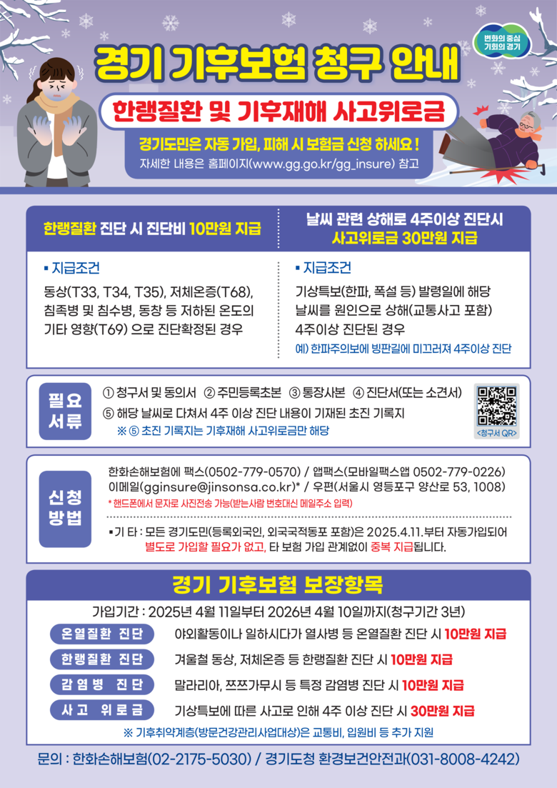 경기 기후보험 지급은 겨울철에도 진행된다. 한랭질환(저체온증, 동상 등) 진단 시 진단비 10만 원을, 한파나 폭설로 인해 4주 이상 상해 진단 시(기상특보 일에 한함) 사고위로금 30만 원을 받을 수 있다.