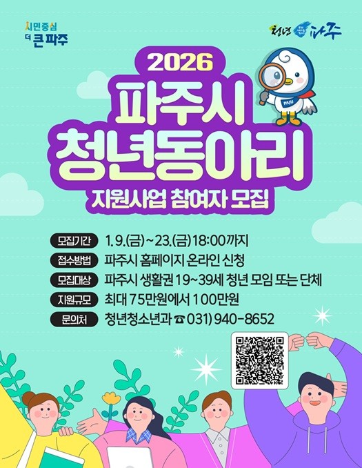 신청은 파주시청 누리집을 통해 가능하며, 사업 신청서, 활동 계획서, 동아리 회원 명단, 활동비 집행계획서 등 관련 서류를 제출해야 한다. 신청 기한은 오는 23일 18시까지다.