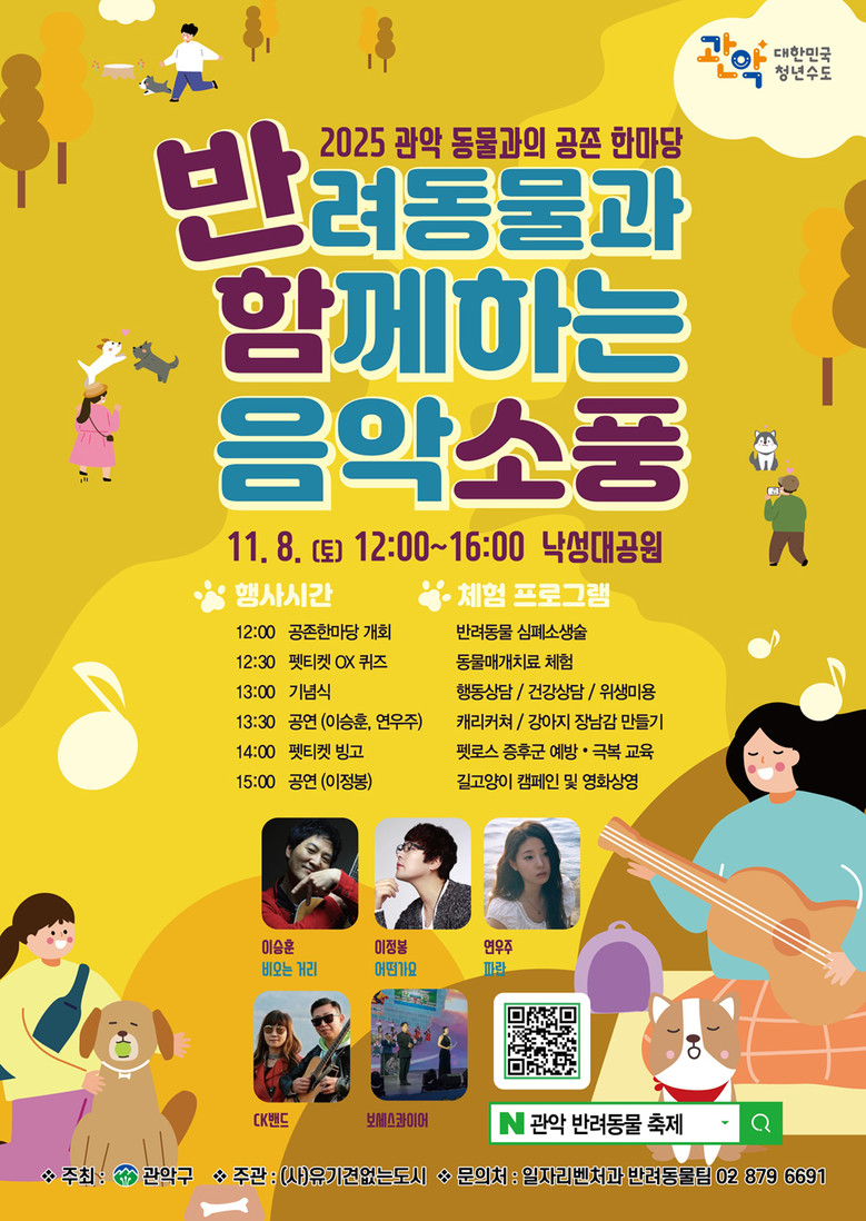 구는 식전 행사로 ‘펫티켓 OX 퀴즈’를 열어 참가자들과 반려동물 예절을 익히며 축제 분위기를 끌어올릴 예정이다. 이후 본 무대에서는 이정봉, 이승훈, 연우주 등 초대 가수의 다채로운 공연이 이어진다.