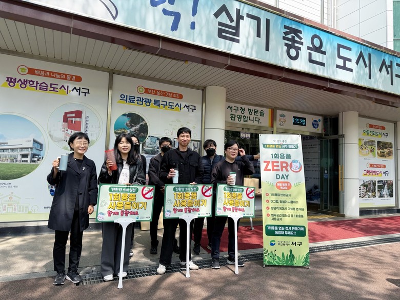 [서구 세계타임즈=이용우 기자] 부산 서구(구청장 공한수)는 지난 10일 서구청 본관에서 공공기관의 1회용품 사용 줄이기를 주제로 『청사 내 ‘1회용품 ZERO DAY’』를 추진해 공직자가 한 발짝 앞서 탄소 배출 줄이기에 앞장서는 모습을 보였다.