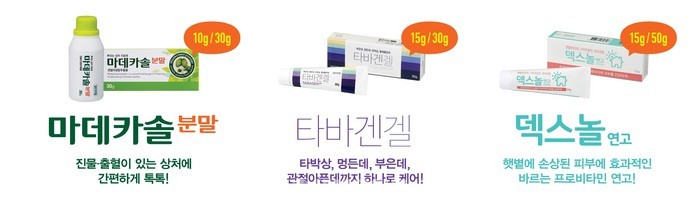 또 동국제약은 타박상 치료제 타바겐겔, 흉터치료제 시카케어, 일광화상 치료제 덱스놀을 출시해, 맞춤형 상처 치료제 풀 라인을 갖추어 소비자들의 선택폭을 확대했다. 이들 제품들은 모두 가까운 약국에서 구매할 수 있다.