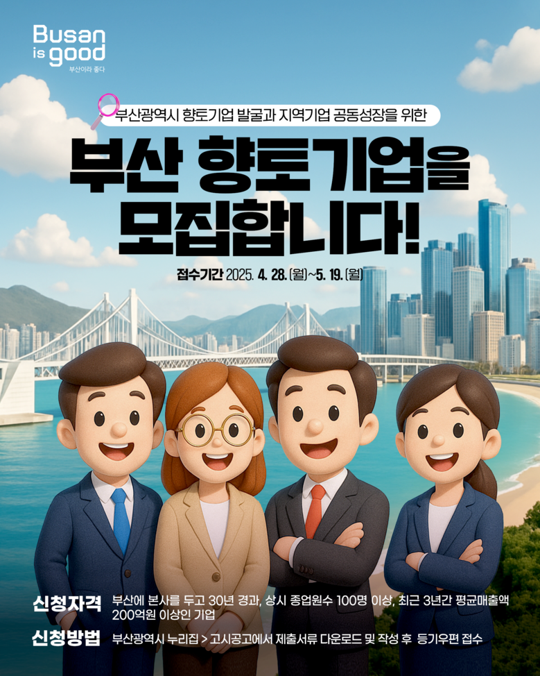 ◈ 선정기업에는 ▲시 향토기업 인증현판 및 인증서 수여 ▲중소기업 이차보전 등 자금한도 상향 ▲해외시장개척단(무역사절단, 해외전시박람회 참가) 선정 우대 ▲시군구 공영주차장 및 광안대교 이용료 [부산 세계타임즈=이용우 기자] 부산시(시장 박형준)는 지역 산업 기반을 이끌어 온 부산 연고 기업을 대상으로 '2025년 부산시 향토기업'을 공개 모집한다고 밝혔다.