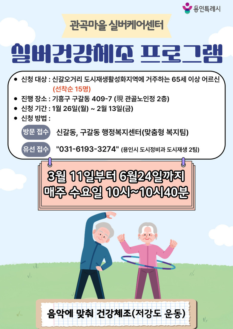 참여 대상은 신갈오거리 도시재생활성화지역에 거주하는 65세 이상 어르신이며, 실버건강스쿨과 실버건강체조 프로그램에 각각 15명을 선착순 모집한다.