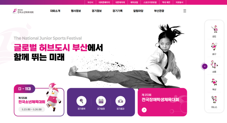 ◈ 누리집은 모바일 기기로도 쉽게 접속할 수 있으며, 오픈기념 퀴즈 이벤트 통해 500여 명 대상으로 다양한 경품을 제공할 예정 [부산 세계타임즈=이용우 기자] 부산시(시장 박형준)는 부산 시민의 염원과 기대 속에서 「제20회 전국장애학생체육대회」 및 「제55회 전국소년체육대회」의 공식 누리집을 각각 오픈했다고 밝혔다.