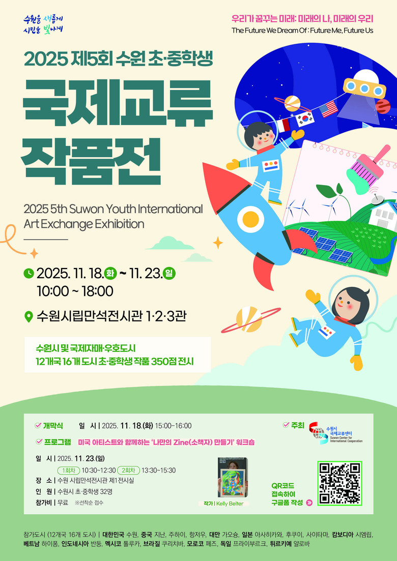 ‘우리가 꿈꾸는 미래’를 주제로 열리는 ‘2025 제5회 수원 초·중학생 국제교류 작품전’에서는 세계 각국의 청소년이 미래 사회와 자신이 꿈꾸는 삶을 표현한 작품을 선보인다. 수원시국제교류센터가 주최한다.