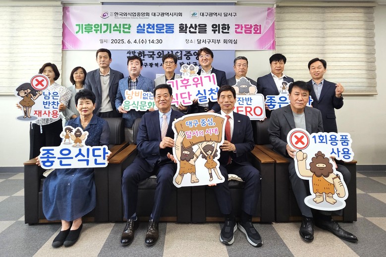 [달서구 세계타임즈=한윤석 기자] 대구 달서구(구청장 이태훈)는 (사)한국외식업중앙회 대구광역시지회장 및 9개 구‧군 지부장과 간담회를 열고, ‘기후위기식단 실천운동’의 대구시 전역 확산을 위한 공동 협력 방안을 논의했다고 6일 밝혔다.