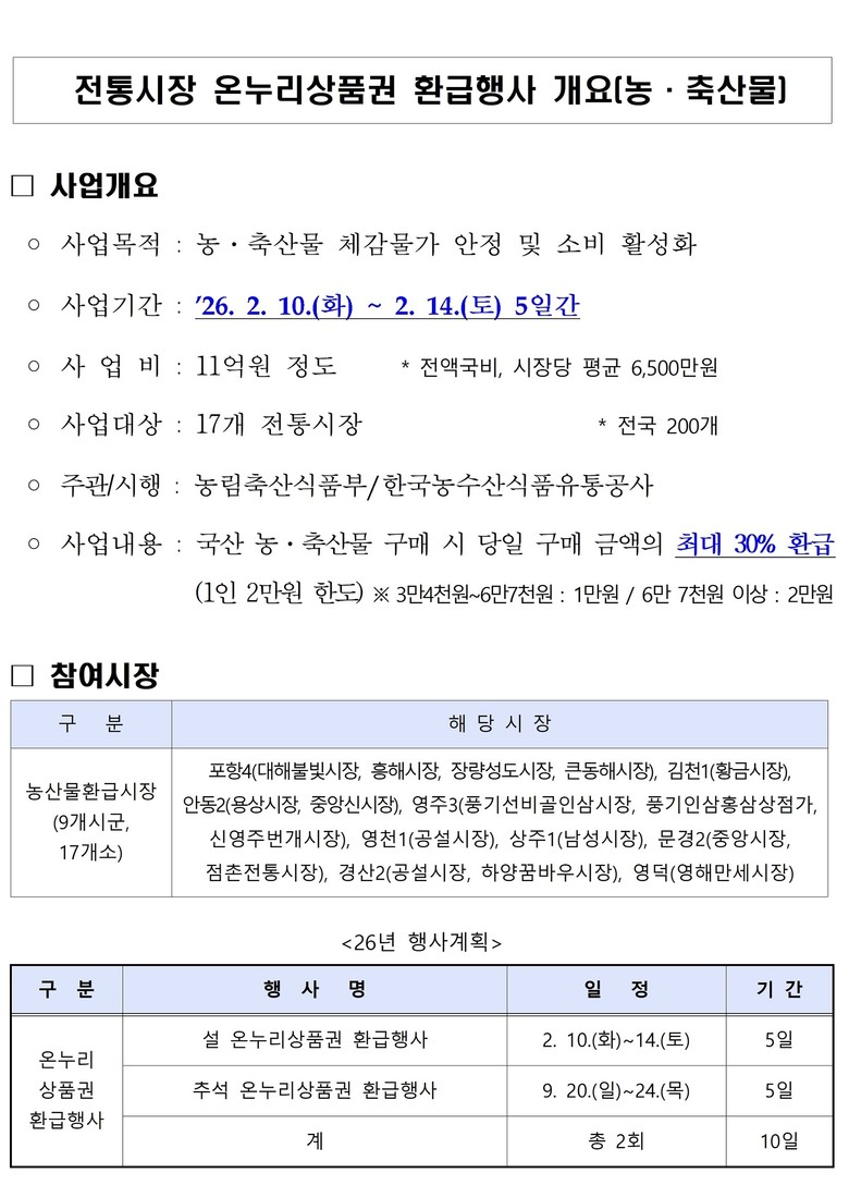 [경북 세계타임즈=한윤석 기자] 경상북도는 설 명절을 맞아 2월 10일부터 14일까지 5일간, 도내 17개 전통시장에서 국내산 농.축산물을 구매하면 구매 금액의 최대 30%를 온누리상품권으로 환급하는 행사를 진행한다. 이번 행사는 농림축산식품부와 한국농수산식품유통공사 주관으로 설 명절 장바구니 물가 부담을 완화하고 전통시장 매출 증대를 도모하기 위해 마련됐다.