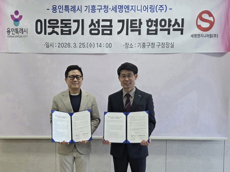 기흥구는 지난 25일 구청장실에서 세명엔지니어링㈜(대표 김석현·김삼동)과 ‘이웃사랑 성금 정기 기탁’을 위한 협약을 했다. 세명엔지니어링㈜은 오는 4월부터 매달 성금 100만 원을 기탁해 지역 내 취약계층 가정 지원과 복지사각지대 해소를 위한 다양한 사업에 동참한다. 김석현 대표는 “기업의 성장에는 지역사회의 응원과 신뢰가 큰 힘이 됐다”며 “앞으로도 지역 주민과 함께 성장하는 기업으로서 사회적 책임을 다하고, 지속적인 나눔을 통해 따뜻한 기흥을 만드는 데 힘을 보태겠다”고 했다.