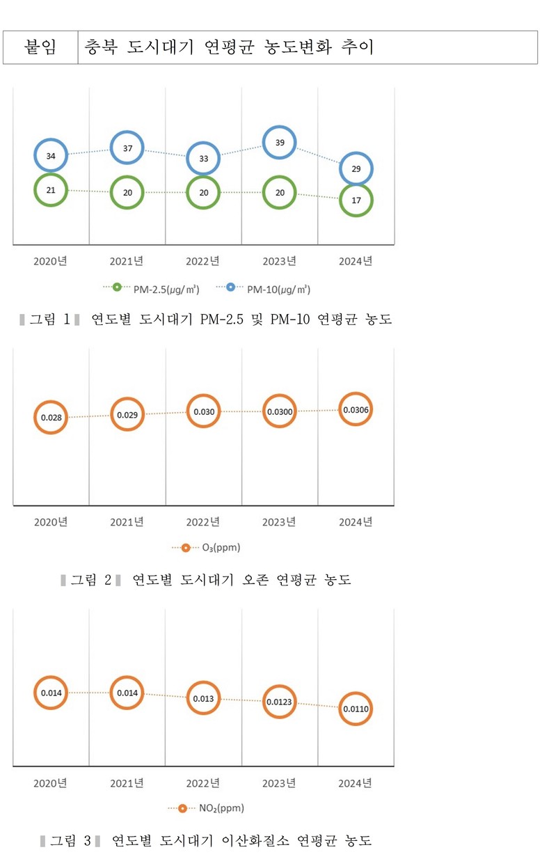 2024년 충북의 연평균 미세먼지(PM-10) 농도는 29 ㎍/㎥이고, 초미세먼지(PM-2.5) 농도는 17 ㎍/㎥로, 2023년 대비 각각 10 ㎍/㎥, 3 ㎍/㎥ 감소하였으며, 오존 농도만 0.0306 ppm으로 2023년 대비 소폭 증가했다.