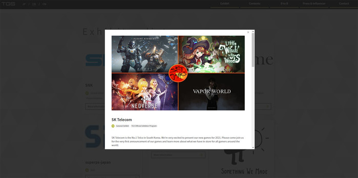 SKT는 지난 6월에 열린 ‘E3 2021’ 및 8월에 열린 ‘게임스컴’에도 참가한 바 있으며, 특히 E3 2021에서는 관람객들이 선정한 ‘가장 인기 있는 온라인 부스’로 선정되기도 했다.