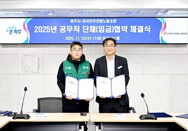 [파주시 세계타임즈=송민수 기자] 파주시는 전국민주연합노동조합 파주시지부(공무직 근로자의 교섭대표)와 지난 12일 ‘2025년 단체·임금협약’을 체결했다고 밝혔다.