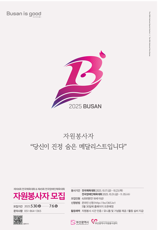 ◈ 선발된 자원봉사자는 전국체전(10.17.~10.23.), 전국장애인체전(10.31.~11.5.) 및 9월에 열리는 발대식 등에 활동할 예정 [부산 세계타임즈=이용우 기자] 부산시(시장 박형준)는 내일(30일)부터 7월 6일까지 제106회 전국체전 및 제45회 전국장애인체전 자원봉사자를 모집한다고 밝혔다.