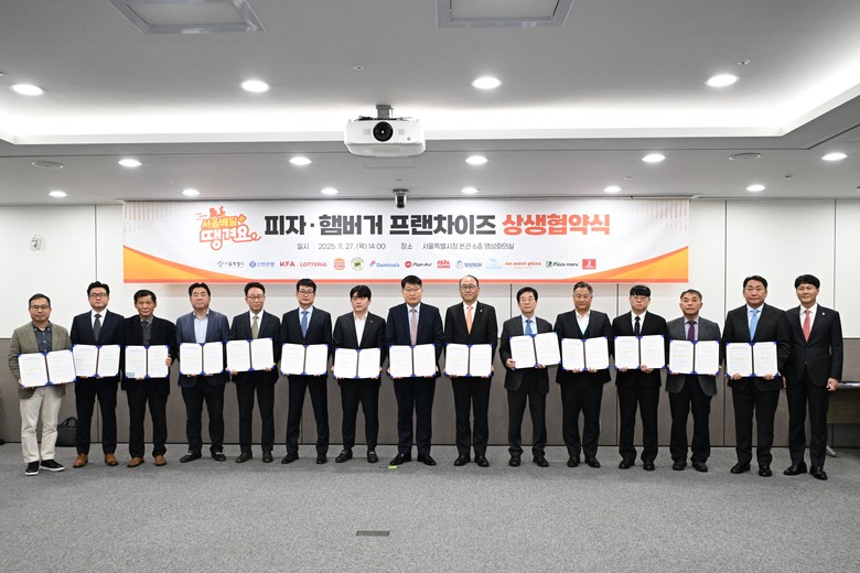 시는 11월 27일(목) 오후 2시, 서울시청 영상회의실에서 신한은행(은행장 정상혁), 한국프랜차이즈산업협회(회장 정현식) 및 피자‧햄버거 분야 11개 대표 프랜차이즈 본사와 함께 「서울배달+ 땡겨요 활성화를 위한 피자‧햄버거 프랜차이즈 상생 협약」을 체결했다.