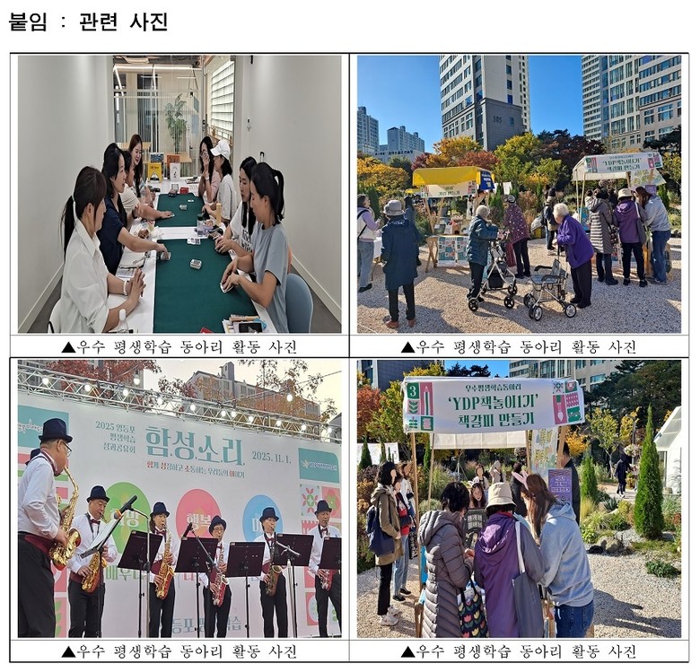 특히 YDP책놀이1기 동아리는 YDP미래평생학습관의 ‘책놀이지도사’ 프로그램 수강생들이 모인 학습동아리로, 지난해 영등포구 평생학습 성과공유회에서 책놀이를 알리는 체험 부스를 운영해 큰 호응을 얻었다. 동아리는 지역사회 아이들과 그림책을 함께 읽은 후 이야기 속 주제와 인물을 다양한 놀이활동으로 연결하는 체험형 봉사활동을 진행했다.