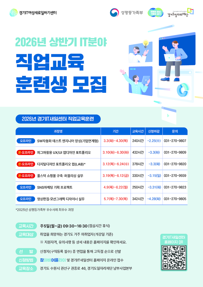 - SW자동화 테스트 엔지니어 양성, 디지털 디자인 포트폴리오 LAB 등 7개 과정 [경기도 세계타임즈=송민수 기자] 경기도일자리재단 경기IT새일센터는 3월부터 상반기 IT(정보기술) 직업교육 훈련 7개 과정을 운영하고, IT 분야 취업을 희망하는 136명의 교육생을 모집한다.