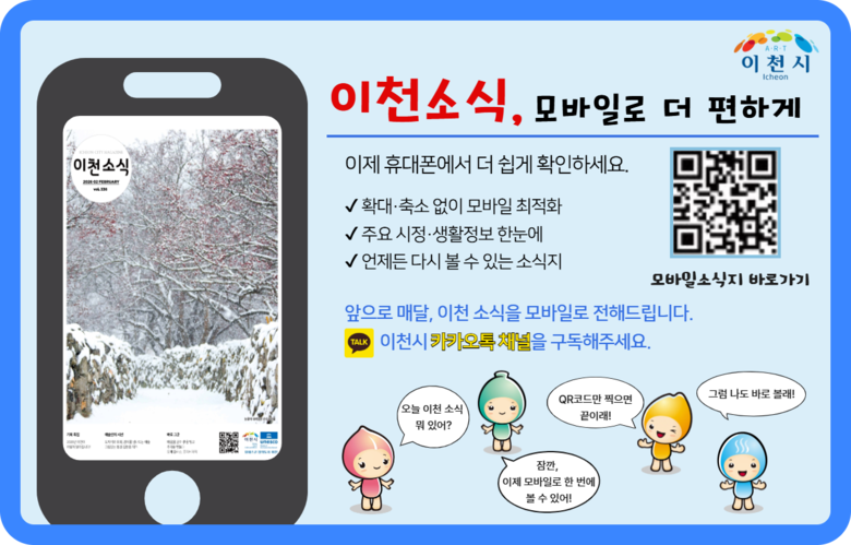한편 이천소식지 모바일판은 도메인 주소(www.icheon2000.kr)나 이천시청 누리집과 공식 사회관계망서비스(SNS), 그리고 종이 소식지에 삽입된 큐알(QR)코드를 통해 누구나 무료로 열람할 수 있다.