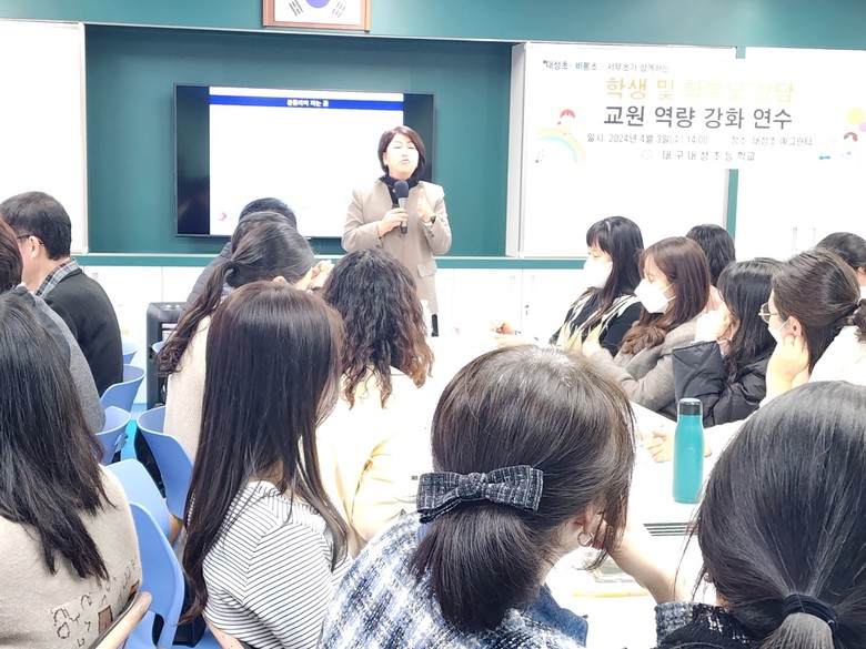 [대구 세계타임즈=한윤석 기자] 대구대성초등학교(교장 양순희)는 지난 4월 3일(수) 대성초·비봉초·서부초의 희망 교원 44명을 대상으로 ‘학생 및 학부모 상담 역량 강화 위한 소규모학교 공동 연수’를 실시하였다.