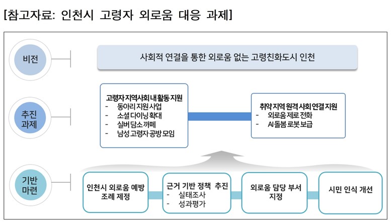 인천연구원 정혜은 연구위원은 “외로움은 고령자의 정신건강과 직결되는 중대한 사회적 문제로, 지자체 차원에서 예방 중심의 정책 전환과 맞춤형 대응 체계 구축이 필수적”이라며 “지역 특성에 기반한 다층적 지원 방안을 적극 검토해야 한다”고 말했다.