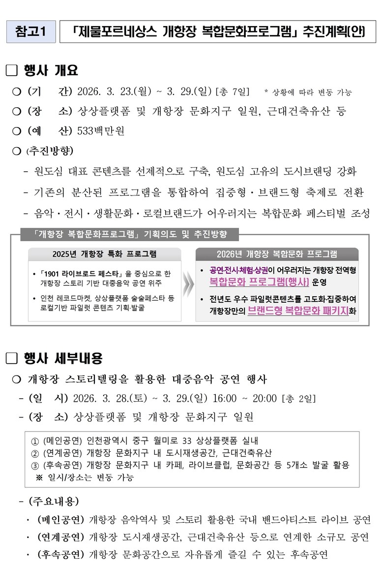 이번 프로그램은 음악·문화·근대건축유산 등 개항 이후 형성된 개항장 일대의 고유한 지역 자산을 활용한 문화·관광 복합 콘텐츠로, 단순 관람형 행사를 넘어 시민 참여와 지역 상생을 중심에 둔 지속 가능한 문화 프로그램으로 육성한다는 점에서 의미가 있다.