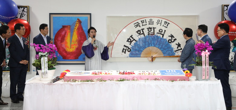 이날 대회장 김주영 국회의원은 축사를 통해 "무엇보다 이번 국회특별전은 22대 국회 개원에 맞춰 우리사회의 갈등해소와 봉합, 그리고 치유를 위한 작품을 처음으로 공개 전시하고, 더불어 국민을 위한 '평화ㆍ화합의 정치'를 바라는 초대형 '통합의 바람부채'를 국민들과 함께 제막식을 할 수 있게 되어 매우 기쁘고 뜻 깊게 생각한다"고 말했다.