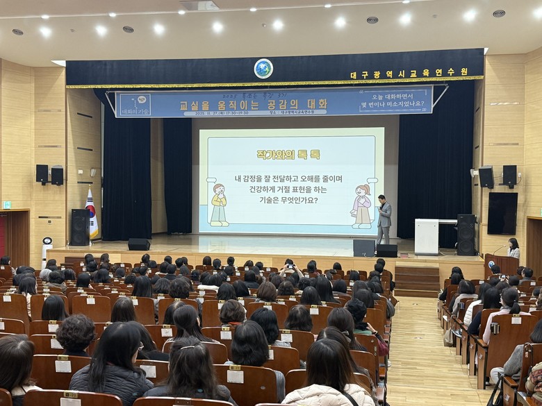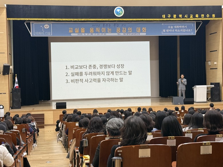 [대구 세계타임즈=한윤석 기자] 대구교육연수원(원장 이옥정)은 11월 27일(목) 대구교육연수원 대강당에서 교원 및 교육전문직원 400여 명을 대상으로 ‘교실을 움직이는 공감의 대화'를 주제로‘2025 톡 쏘는 특강(3기)’을 진행했다.