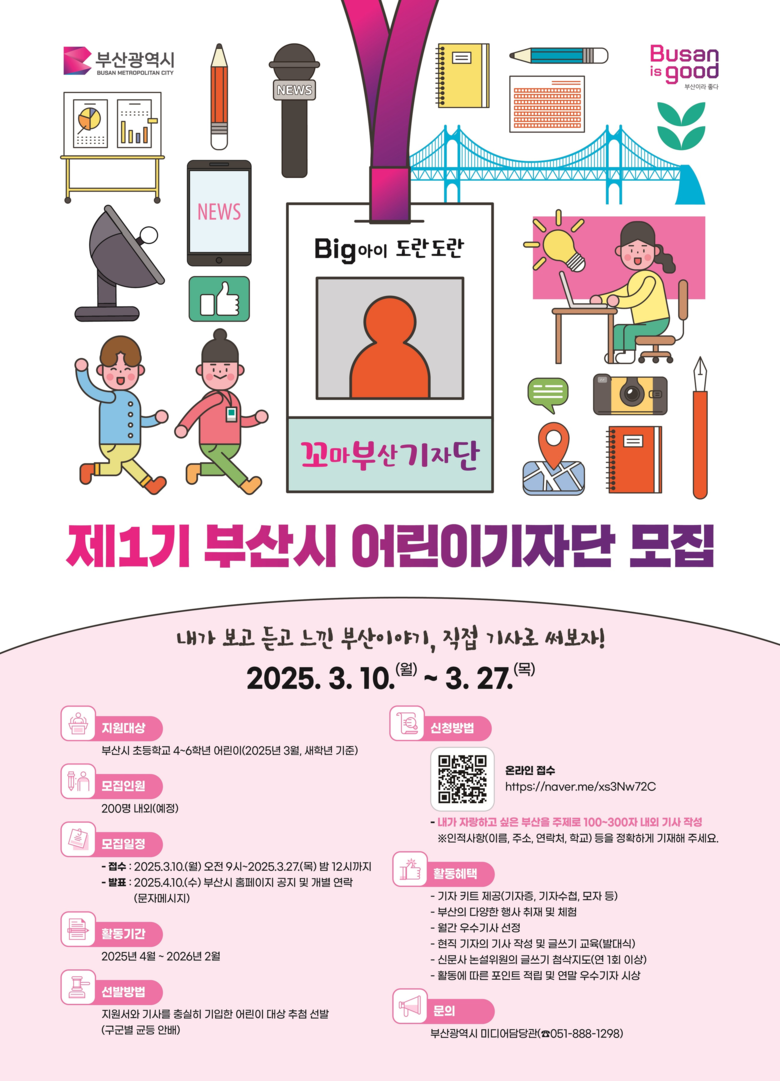 ◈ 선발된 제1기 어린이기자단(2025.4.~2026.2.)에게는 부산의 다양한 행사 취재 및 체험 기회, 기자 키트, 글쓰기 특 [부산 세계타임즈=이용우 기자] 부산시(시장 박형준)는 오는 6월 부산 어린이신문 「Big(빅)아이 도란도란」 창간을 앞두고, 어린이들이 직접 취재하고 기사를 작성하는 '제1기 부산시 어린이기자단(꼬마부산기자단, 꼬부기단)'을 모집한다고 밝혔다.