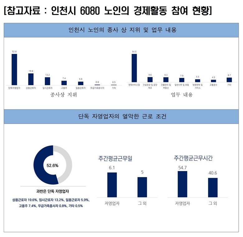 인천시민 60~80세 노인 대상 설문조사 결과, 60.1%의 노인이 어떠한 형태로든 경제활동에 참여하고 있었으며, 그중 52.6%는 단독 자영업자로 이들은 주간 근무일(평균 6.1일) 및 주간 근무시간(평균 54.7시간)이 다른 근로 형태에 비해 길어 상대적으로 열악한 노동환경에서 일하고 있었다.