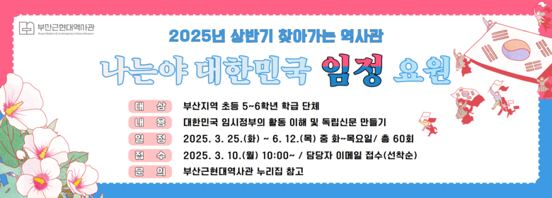 한편, 프로그램과 관련된 기타 자세한 사항은 역사관 누리집 공지사항을 참고하거나 운영팀(☎ 051-607-8031)으로 문의하면 된다.