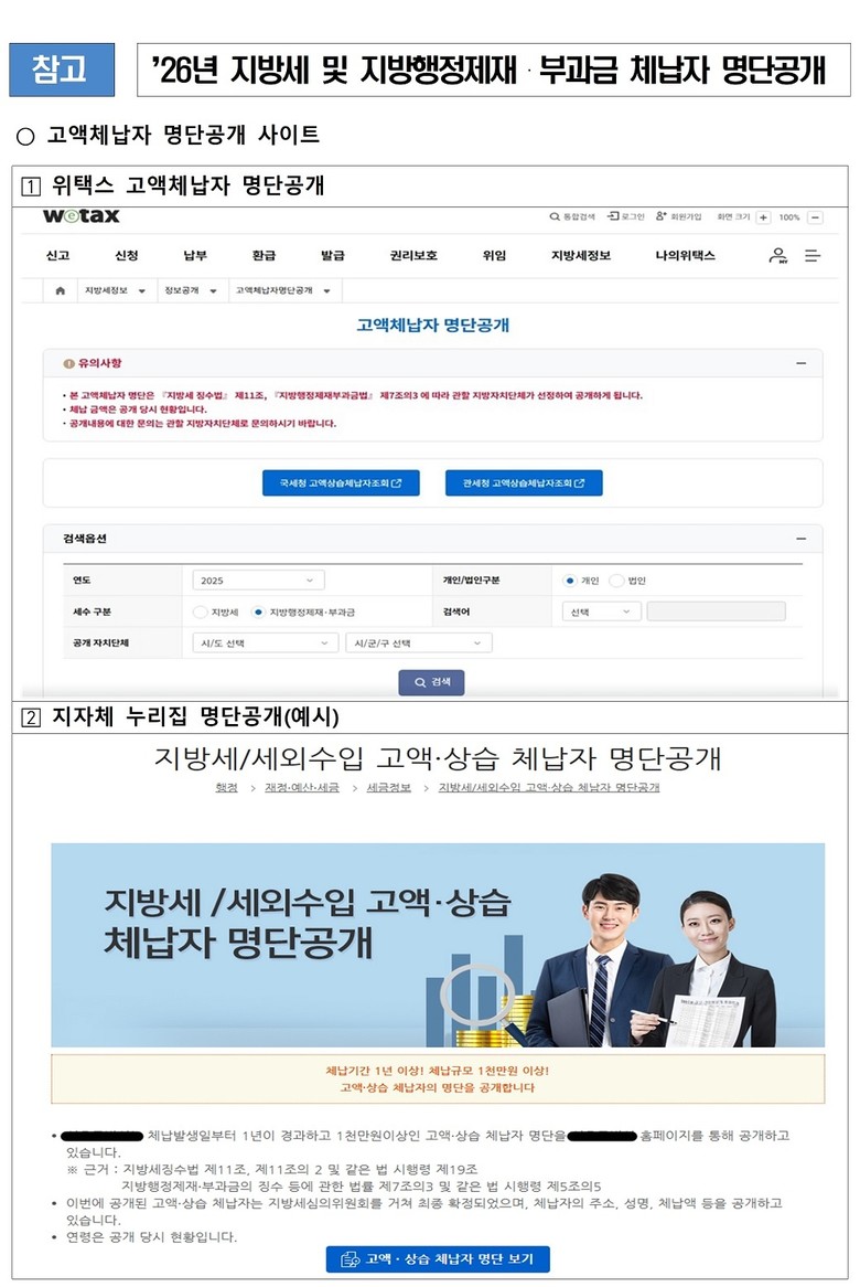 명단공개 대상은 납부 능력이 있음에도 납부하지 않거나 납부 약속을 이행하지 않은 납세기피자를 중심으로 선정했으며 무재산·거주불명 상태라도 부동산이나 자동차 등 압류 가능 재산이 있는 경우도 포함된다.