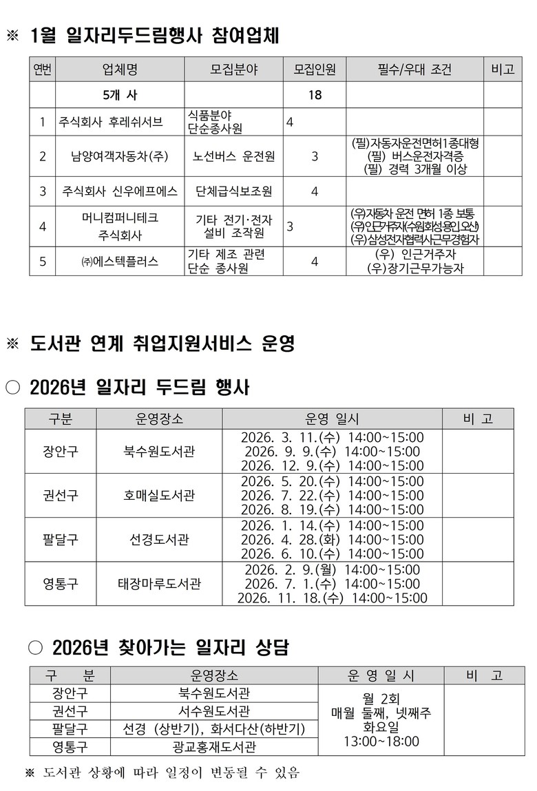 수원일자리센터가 주관하는 ‘일자리 두드림’은 취업에 어려움을 겪는 구직자와 인재 채용을 원하는 기업을 연결해 주는 소규모 채용 행사다. 구직자들이 채용 행사장을 쉽게 찾아올 수 있도록, 올해는 접근성이 좋은 도서관과 연계‧협업해 행사를 열 예정이다.
