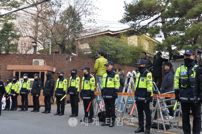 박근혜 전 대통령의 검찰 소환을 하루 앞둔 20일 오전 서울 강남구 박 전 대통령 자택 앞 경찰 경호 인력이 강화되고 있다. 2017.03.20.