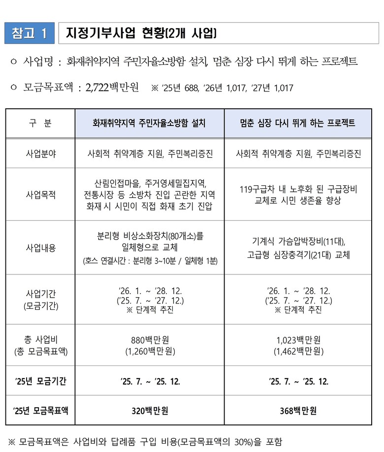 최종 선정 사업은 사회적 취약계층 지원, 주민 복리증진 분야로, ▲「화재취약지역 주민자율소방함 설치」 ▲「멈춘 심장 다시 뛰게 하는 프로젝트」다.
