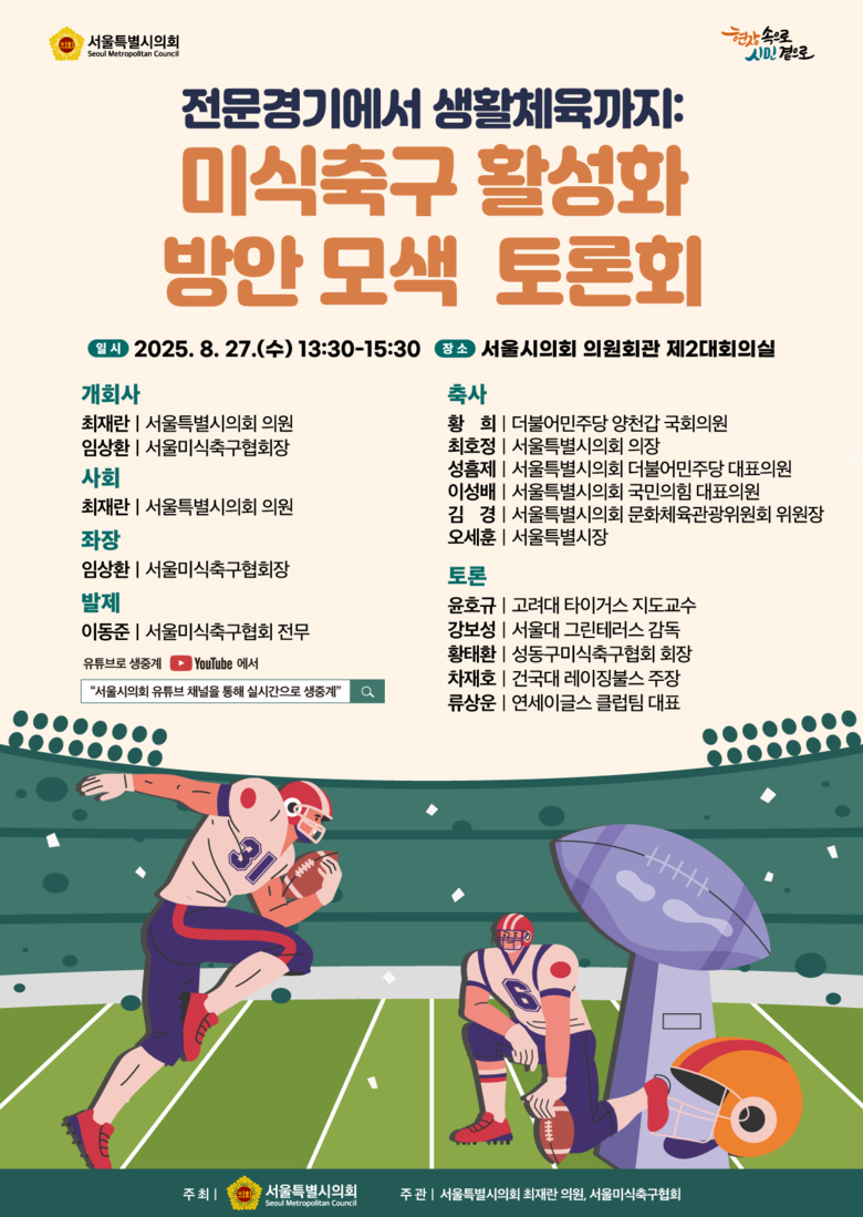 토론회는 오는 8월 27일(수) 오후 1시 30분, 서울시의회 의원회관 제2대회의실(서소문별관 2동 2층)에서 「전문경기에서 생활체육까지 : 미식축구 활성화 방안 모색」이라는 주제로 개최한다.