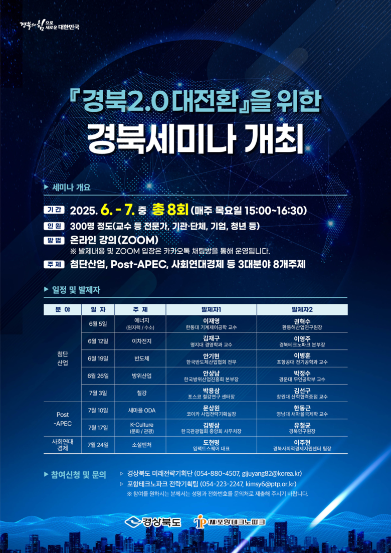 경북 세미나는 트럼프 2기 행정부의 미국 우선주의(America First) 정책에 따른 글로벌 정책환경 변화에 선제 대응하고, 국가정책 연계를 통한 지역 차원의 차별화된 경북 2.0 대전환 전략 구체화 논의를 위한 장으로, 5일부터 매주 목요일, 오후 3시~4시 30분까지 온라인(ZOOM)으로 개최하고 있으며 다음 달 24일까지 계속된다.