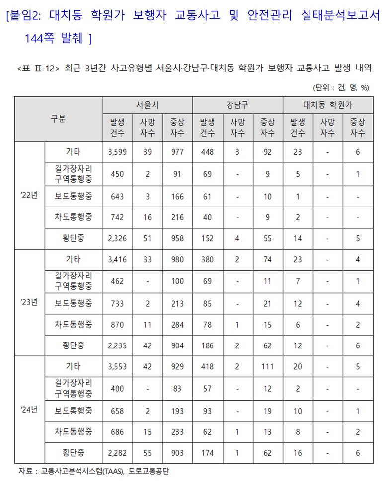 서울특별시의회 윤영희 의원(국민의힘, 비례)이 제안하고 서울시 재정분석담당관이 분석한 자료에 따르면, 최근 3년간(2022~2024년) 서울시 전체 보행자 교통사고 발생 건수는 연평균 1.2% 감소한 반면, 대치동 학원가 일대 보행자 사고는 2022년 45건에서 2024년 56건으로 늘어나는 등 연평균 11.6% 증가해 뚜렷한 대비를 보였다.