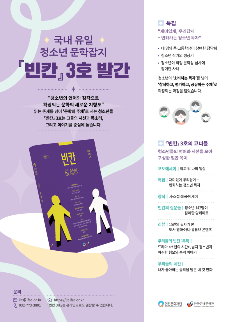 한국근대문학관 관계자는 “『빈칸』은 청소년이 스스로의 시간과 삶을 해석해 나가는 과정을 기록하는 장”이라며, “앞으로도 청소년이 문학을 통해 자신만의 미래를 상상하고 확장해 나갈 수 있도록 지속적으로 지원하겠다.”고 밝혔다.