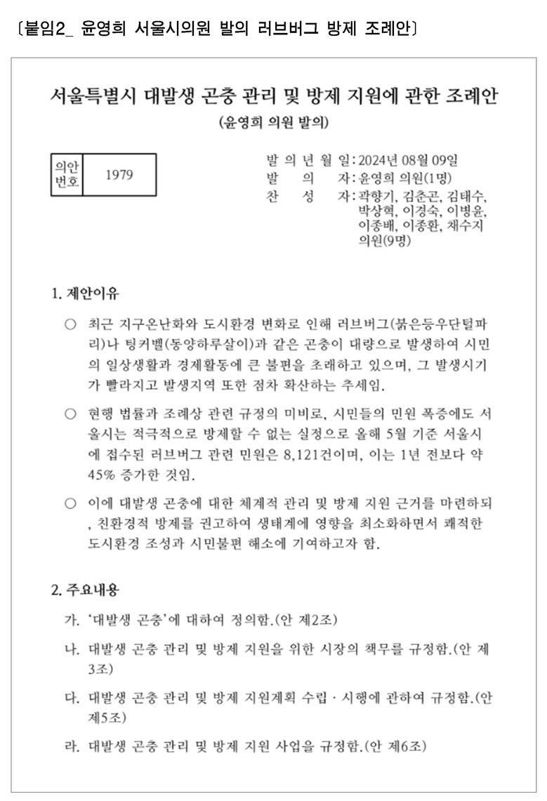 이후 윤 의원은 시민 민원 급증과 반복되는 피해 사례를 근거로 지속적인 공감대 형성과 위원회 설득에 나섰고, 2025년 3월, 해당 조례는 서울시의회 본회의를 통과하며 전국 최초로 제정·공포되었다. 서울시는 해당 조례를 근거로 ‘유행성 생활불쾌곤충 통합관리계획’을 수립하고 본격적인 대응에 돌입했다.